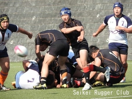 後半も法政大学のアタックに苦戦しましたが、後半17分、成蹊大学がターンオーバーし、そのままパスを繋ぎ7番原島が中央にトライ。